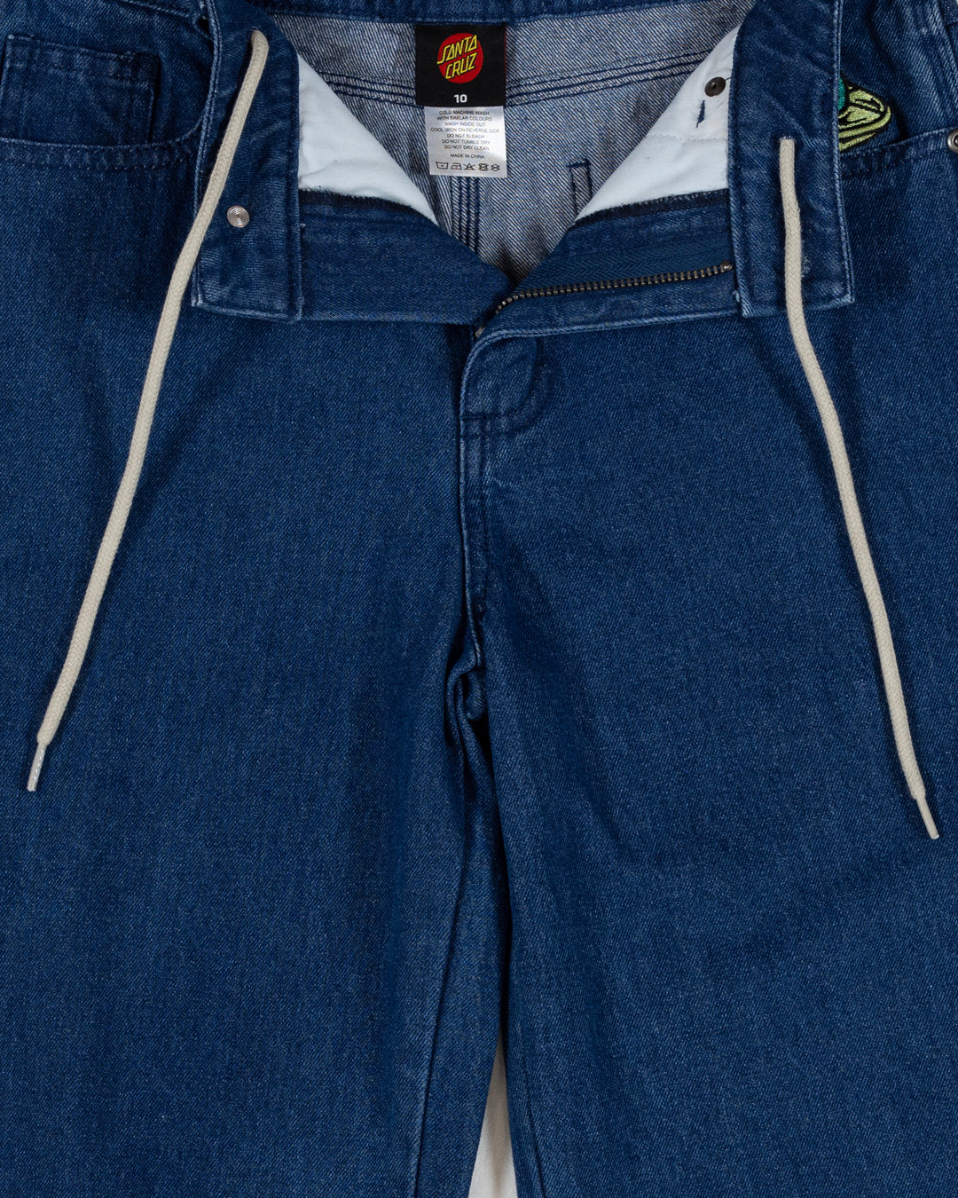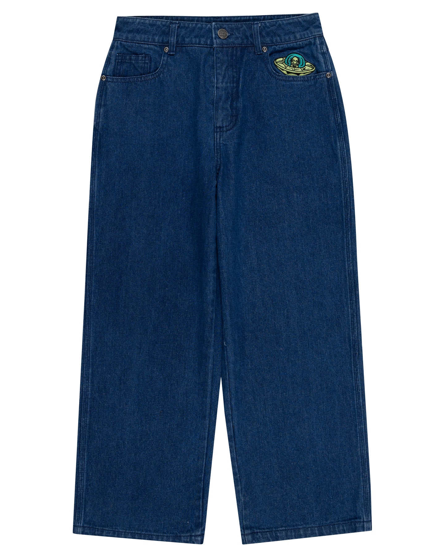 Boys Santa Cruz baggy fit denim pants featuring embroidery of Multi Cruz Stack Alien artwork.