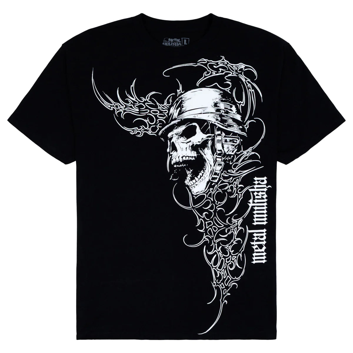 Metal Mulisha War Paint 2 Tee in Black features a large oversized tribal style M/M skull white print on the front and Metal Mulisha down the back.