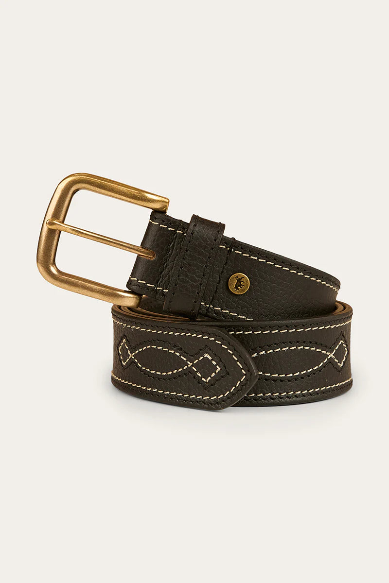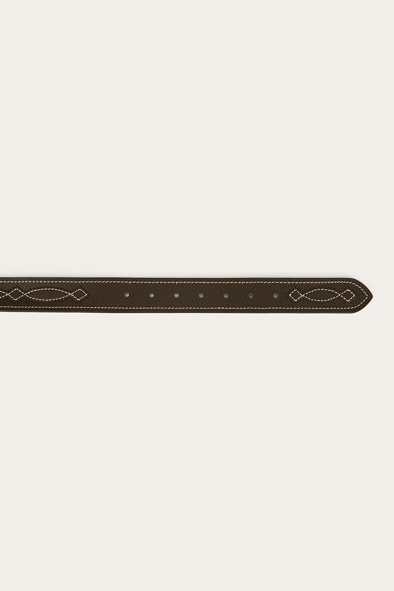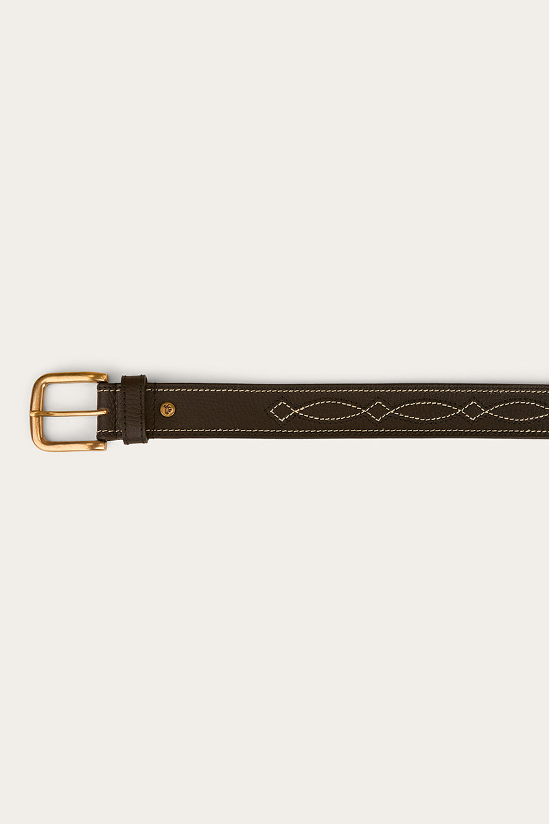 Introducing the Crossover Belt – a perfect blend of timeless Western style and refined elegance. Expertly crafted from premium genuine leather, this versatile belt features a distinctive Western crossover stitch pattern, adding classic texture and standout appeal. The look is elevated by an antique brass buckle, paired with a brass-toned Ringers Western stud, combining rugged charm with polished detail. Whether you're dressing for the office, a night out, or a weekend rodeo, the Crossover Belt brings classic Western flair and sophistication to any outfit.